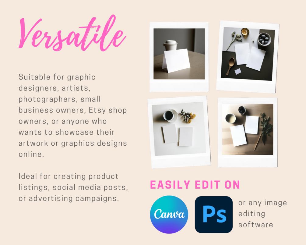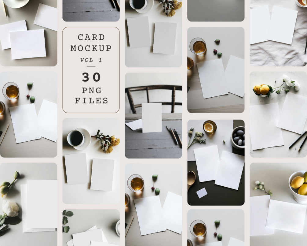 The mockups come as PNG files, and you can easily add your own digital files onto the card using any photo editing software. These mockup files are great for creating unique and professional-looking product listings, social media posts, or advertising campaigns for your online store or portfolio.