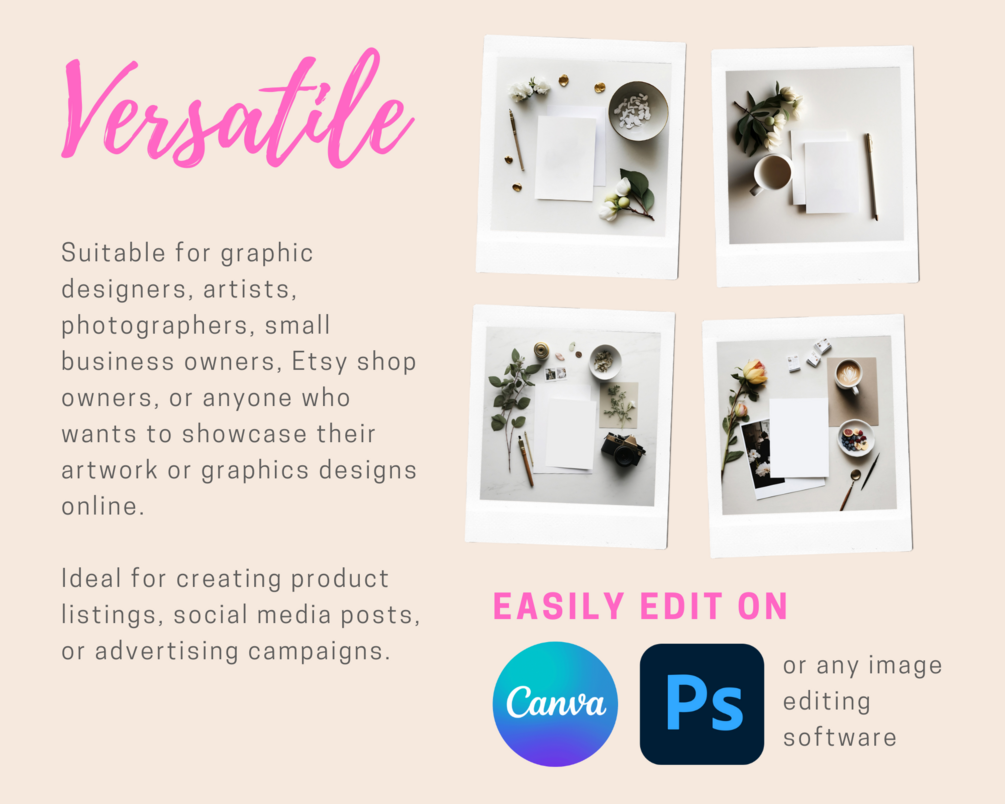 The mockups come as PNG files, and you can easily add your own digital files onto the card using any photo editing software. These mockup files are great for creating unique and professional-looking product listings, social media posts, or advertising campaigns for your online store or portfolio.
