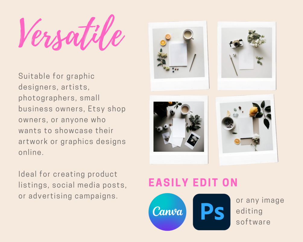 The mockups come as PNG files, and you can easily add your own digital files onto the card using any photo editing software. These mockup files are great for creating unique and professional-looking product listings, social media posts, or advertising campaigns for your online store or portfolio.